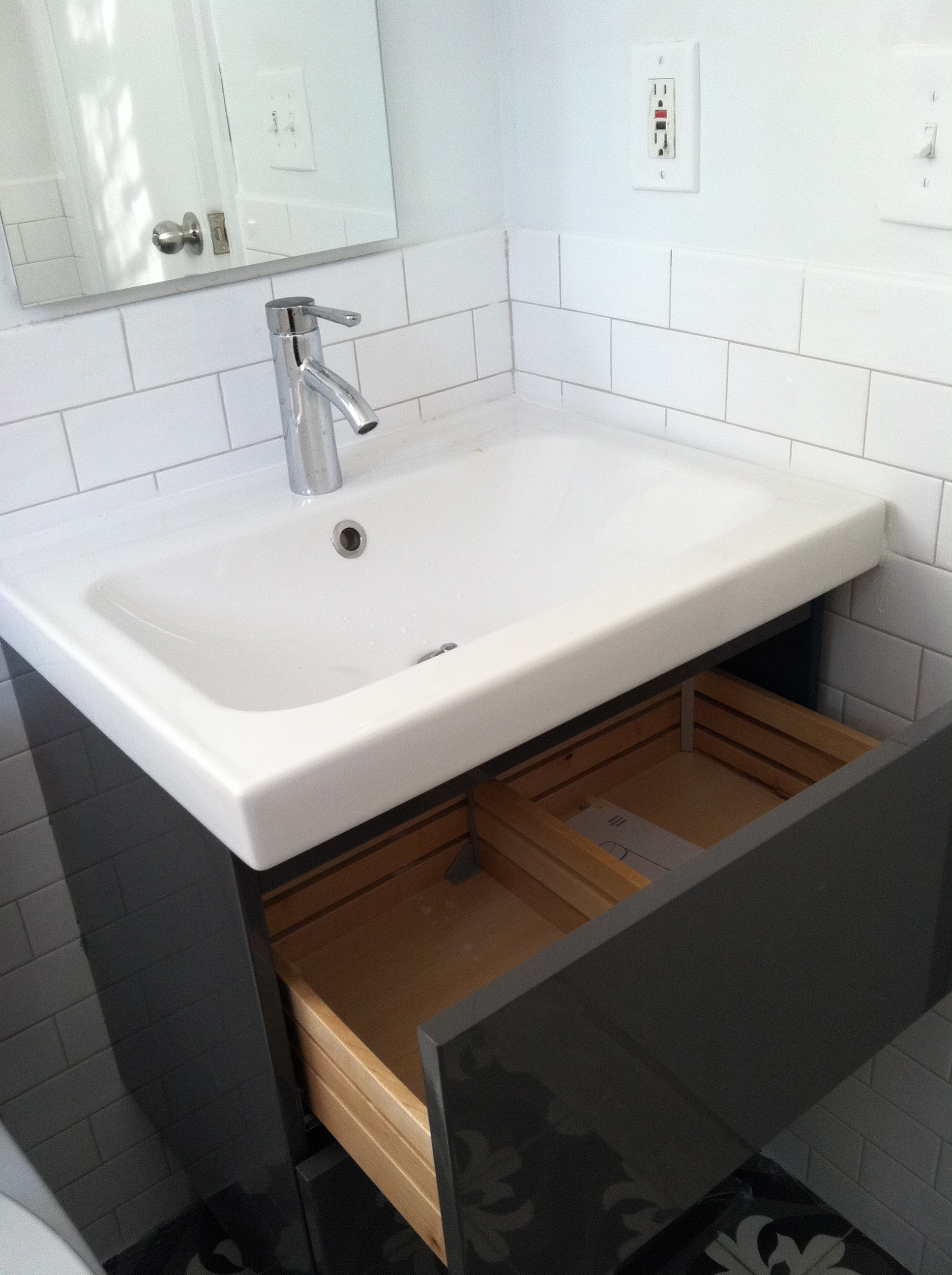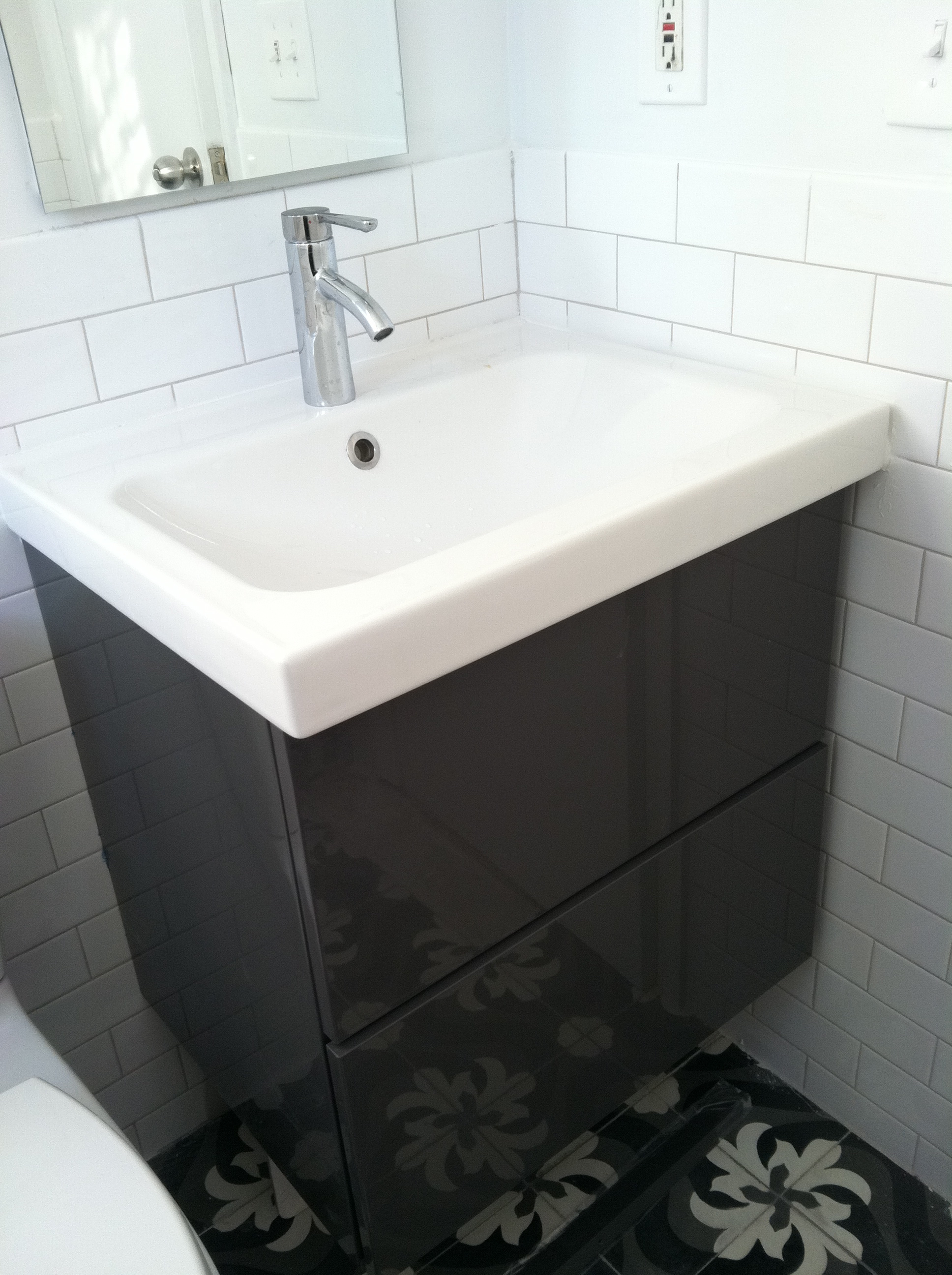 I thought about taking an existing piece of furniture and sawing holes in it for the pipes and plopping a vessel sink on the top. I scoured Ebay. I looked at adapting nightstands which are narrow. I kept my eyes open at yard sales and went to Gothic Cabinet and found nothing that was under 25 inches wide, looked good, had storage and did not cost a thousand dollars. Finally, I found Ikea hit all the notes with their Godmorgon series of vanities, sinks and faucets. The whole shabang – vanity, sink and fancy faucet cost me $360!
