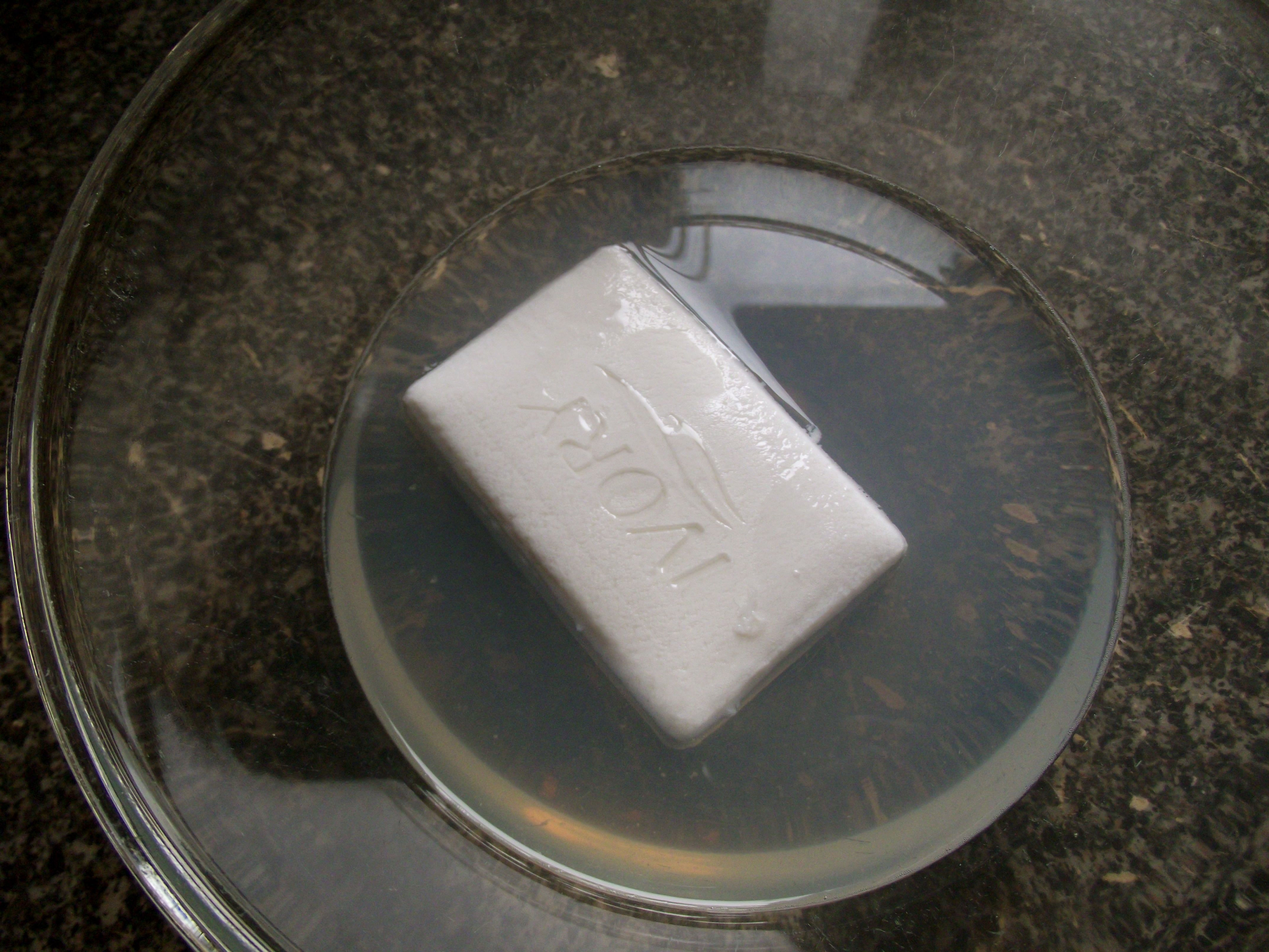 Put the soap with some of the water into a food processor and blend it (adding water if needed) until it is the consistency of whipped cream.
