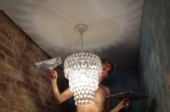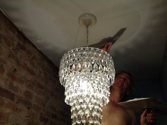 When the new chandelier arrived, Deb came to install it along with her colleague Eric. She told me that it would look so much better to run the cabling inside the ceiling instead of just hiding the wires with a wiremold. Eric was there to plaster away the holes. He even covered the glob that was such an eyesore. Good craftspeople who are skilled and care about what they do are hard to find – I am lucky. More to come…