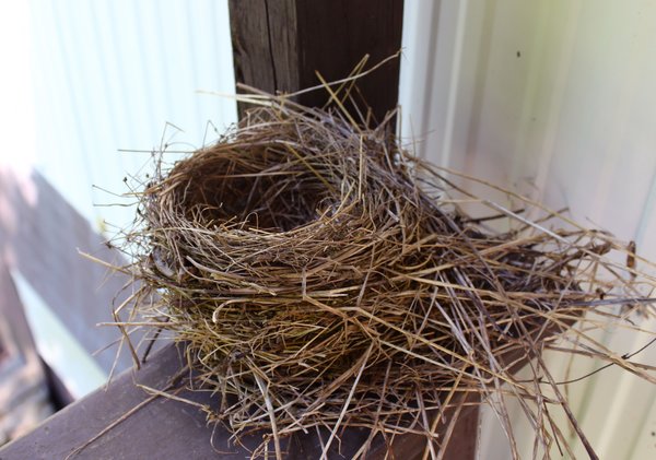 I think we must move the nest. I cannot imagine that the mother will sit on it inches away from the opening and closing of a front door and at waist height of the back and forth of humans and dogs. I decide to move it to another bannister just a little further away from the front door with the hope that the mother will feel safe enough to continue tending her nest. We see her flitting from one branch to another crying piteously. We shoo the dogs into the house and decide to go into town early to give the mother peace and quiet so she can find her nest.