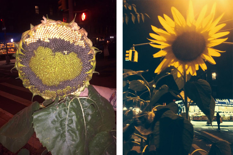 The obvious thing to do is to water the plants. However, there’s no hose or anything to connect a hose to. I buy a watering can from Saifee’s, a hardware and gardening store right across the street from the island. The Tile Bar, which is the closest establishment to the island, allows me to keep the can there and use their water. By the end of October the sunflowers bloom, changing the face of the block.