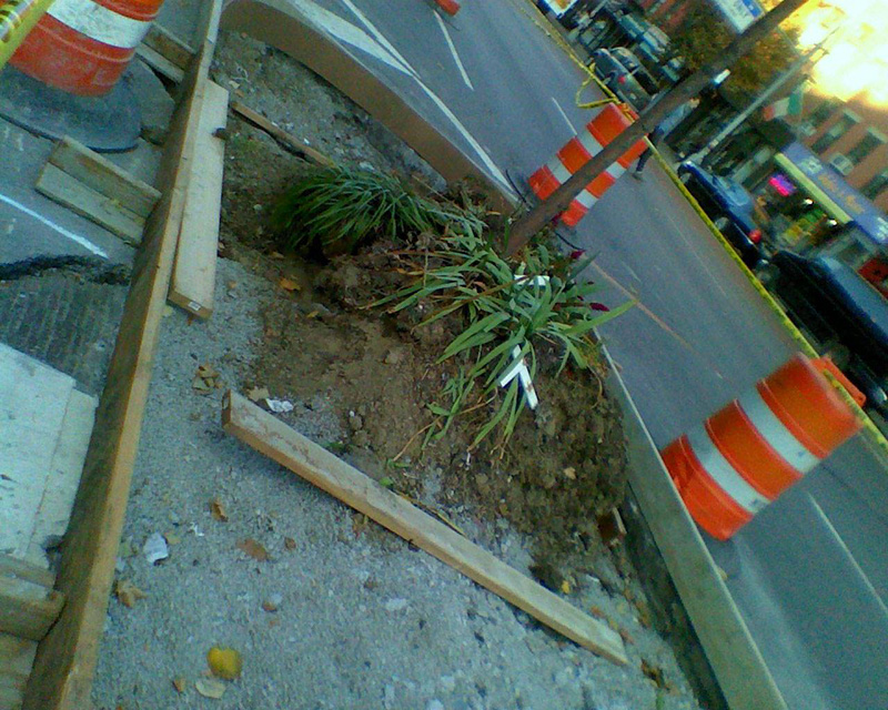 Arriving one Friday afternoon the garden is upside down. After 3 years, the city decides the cement that was used to build the islands was not strong enough. Millions of dollars are spent to re-do the islands. This is what I see.