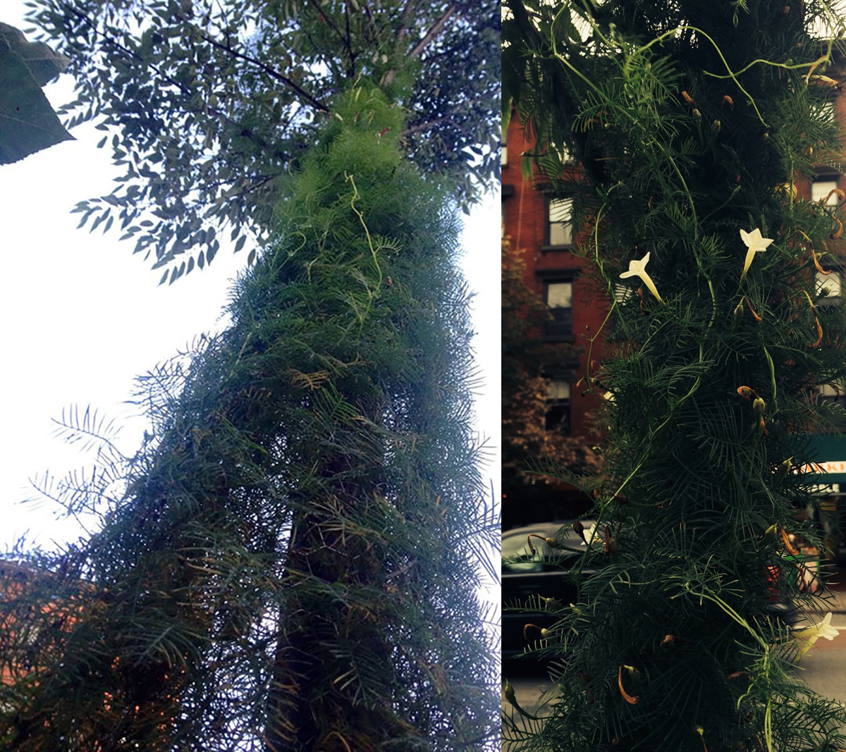 I get an idea to experiment with growing vines around the tree. Saifee’s Gardening store only has Cypress vine seeds so I buy them and sow them around tree. Within a few months they begin to attach themselves to other plants so I buy a yard of chicken wire, place it around the tree and direct the vines to the wire.
