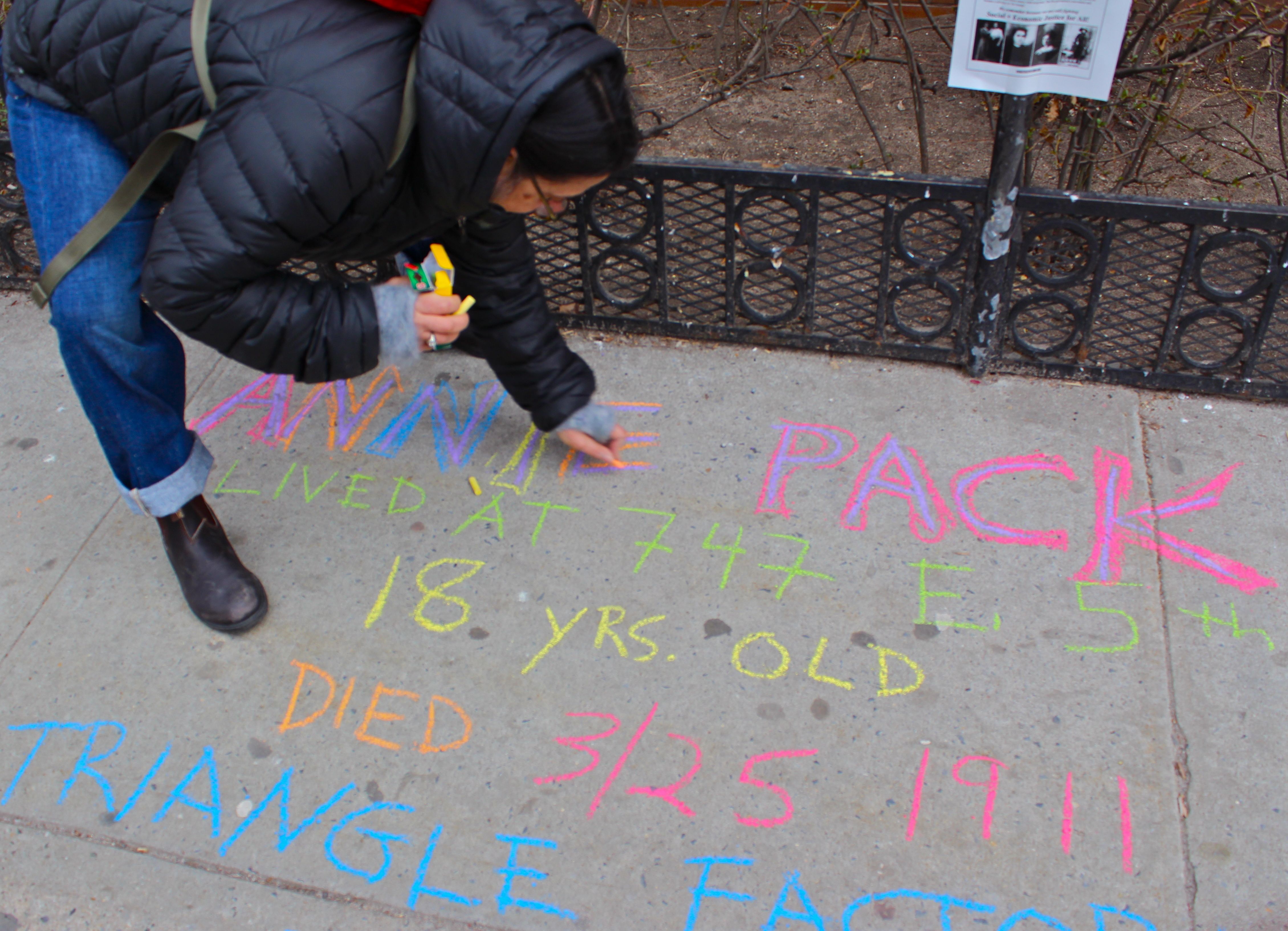 Rita and I began by chalking memorials for three young women who’d lived on East 5th Street. We were silent as we worked, smearing the chalk on the sidewalk. None of the buildings where these girls lived remained, but their addresses did. We chalked their names exactly where their homes stood once long ago. We wondered if they were friends and had walked to work together. They lived so close to each other and they were the only three on that block.