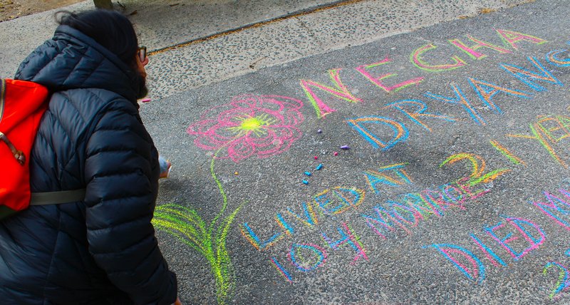 For the past ten years, artist Ruth Sergel has organized CHALK, a memorial project where volunteers “chalk” the names and ages of the victims on the sidewalks in front of their former homes. The colorful chalk memorials are a beautiful and bright tribute to the young women at the place where they lived, laughed and dreamed. The chalk memorials are numerous in our historical neighborhood of immigrants. They are on every block. It is heartbreaking to see so many of them.