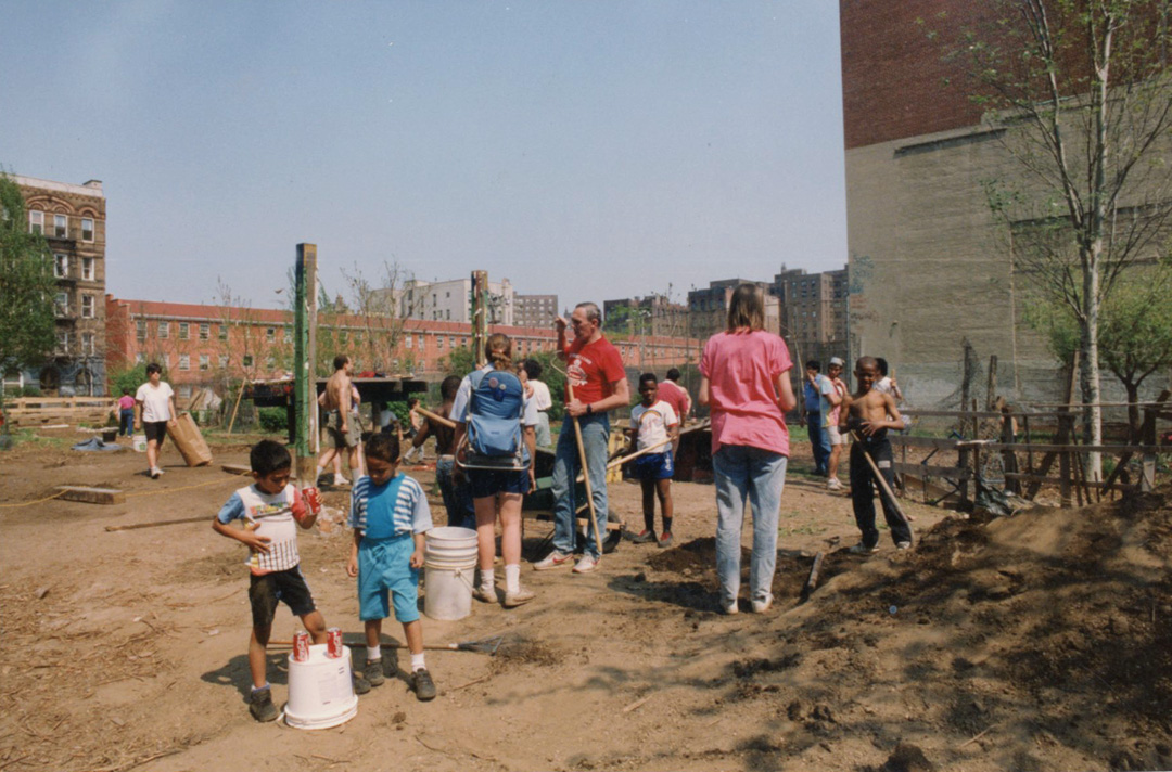 When I arrived at the site for Artmakers La Lucha project it was the summer of 1985 and it was a blighted no-man’s-land. There were many abandoned buildings, empty lots where buildings had tumbled down. Drug selling frenzies were commonplace. Someone would walk out on the street with aluminum packages in his hands and the addicts would swarm with money held high in their fists. Cops just didn’t seem to care. There were blocks where the landscape was fallen brick, debris, graffiti and boarded-up buildings.