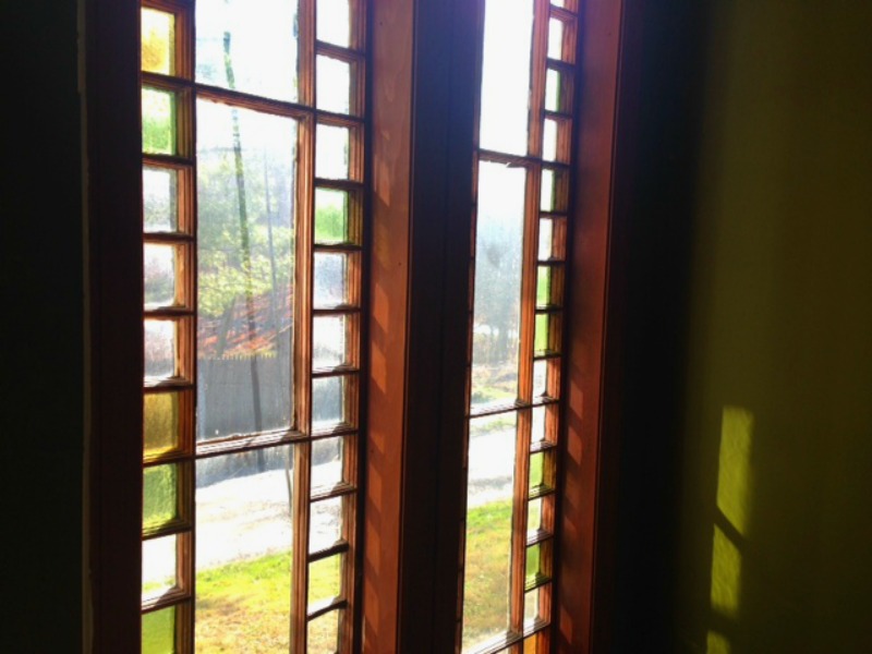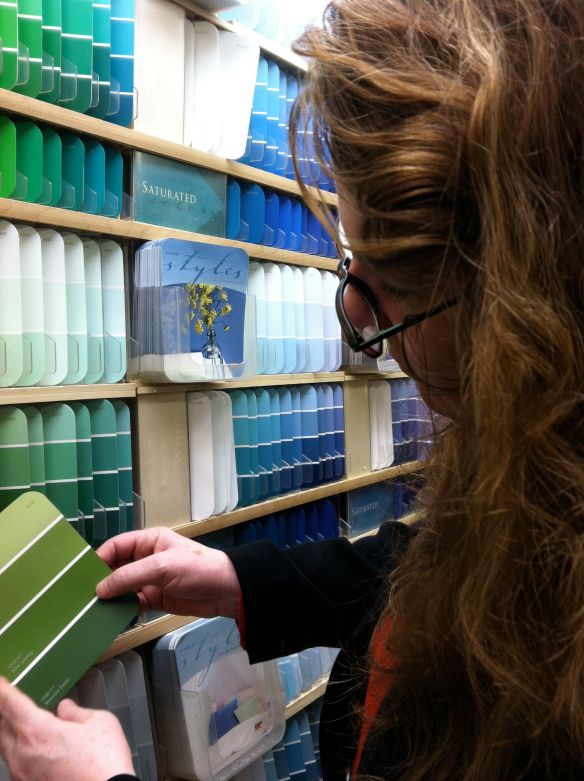 The entryway was the jumping off point to the color scheme because the most striking feature of the apartment is there – beautiful tall windows that are edged with yellow and green stained glass squares. I thought she should put most saturated color there because the apartment has very low ceilings, and though it is sunny in the living room, the windows are rather small. A saturated color in the entryway would be an interesting highlight and would not be oppressive in the small space. A green for the entryway would bring in the outdoor foliage and the colors of the stained glass in the windows.