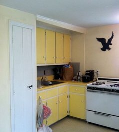 I suggested a un-babyish blue for the living room so that the room would feel expansive and sophisticated. The kitchen counter is yellow and the backsplash is grey tile. The existing color for the cabinets was a yellow that made them the focal point of the room when they shouldn’t have been. I thought a light color would make the cabinets recede and make the kitchen look clean and neat. I sent Camelia some samples I made with the Color Capture app and some paint chips look at in the light of the apartment.