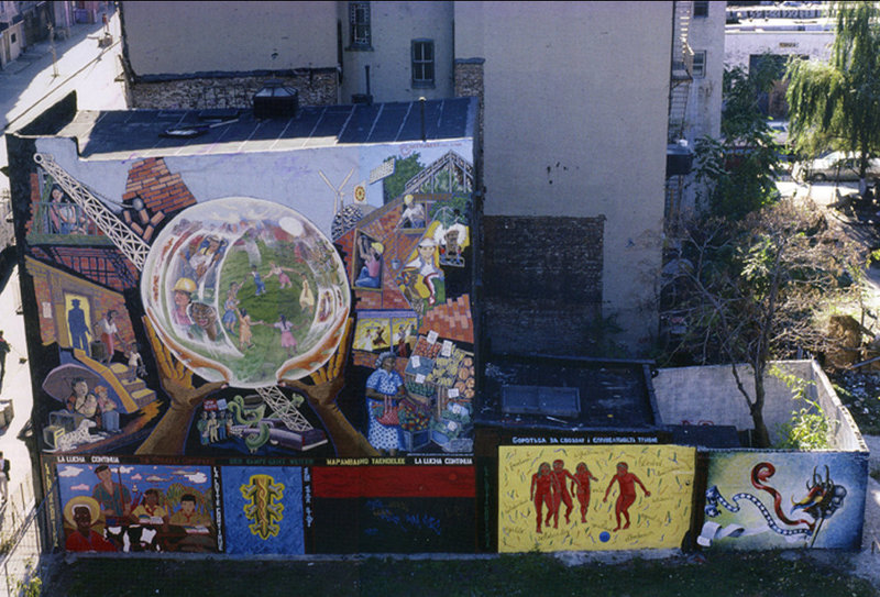 The “La Lucha” project was to put multiple individual murals on this theme and one large group-produced mural in a large area where buildings had tumbled or been demolished between East 8th and East 9th Streets and between Avenue B and Avenue C. A park had been constructed by community residents there but it was a mess—full of weeds, used hypodermic needles and garbage. It was hard to keep the junkies out. Artmakers accepted our proposal and we collaborated with the group of involved artists to clean out the garbage and weeds, prime the walls of the canyon of surrounding buildings and get to work creating a riot of color on the walls. The bleak lot was transformed into a playground, outdoor performance space and a clean, safe place for the community to hang.