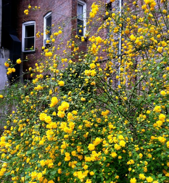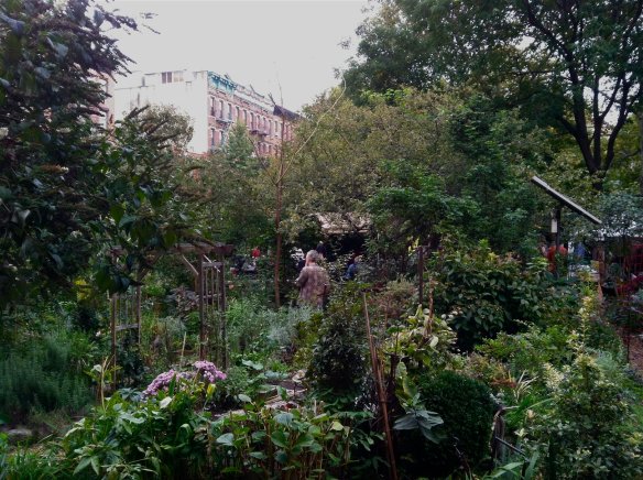 There is a community garden on East 6th Street that does transport me – to England I go. It is what I imagine a garden would look like in someone’s big backyard. It is not manicured like a formal garden of the upper classes, but exuberant and lush. I read once that there are people in England who like to tend their gardens in the nude. I think that it is the kind of garden a naked gardener would have. A wannabee formal garden that is a tiny bit wild.