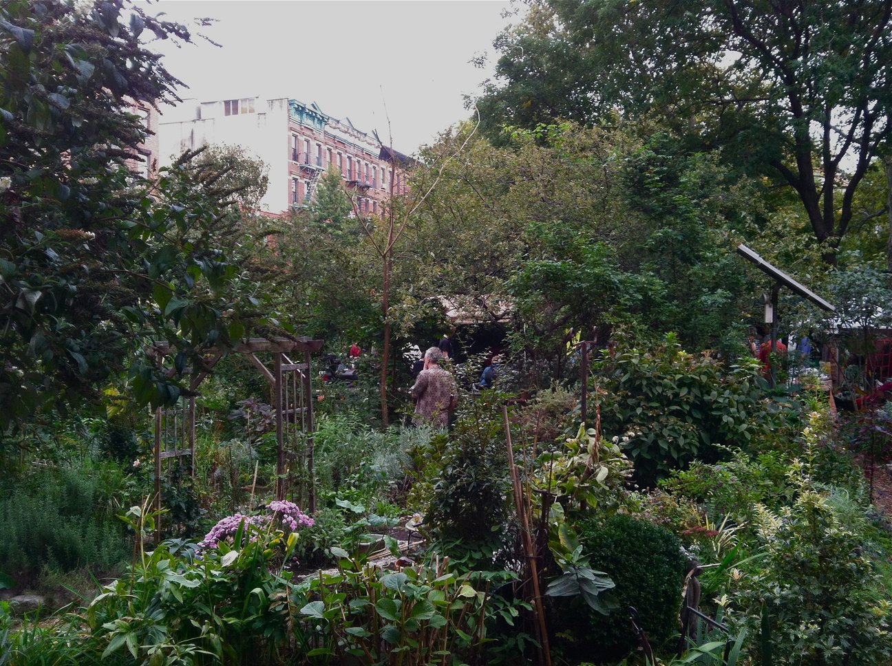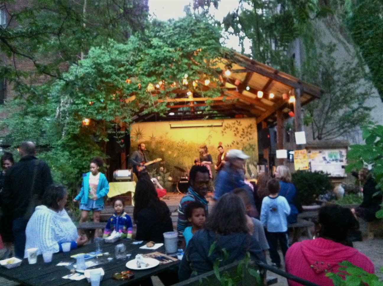 Loisaida has more community gardens than anywhere else in the city. The gardens are like little kingdoms unto themselves, so different are they from one another. Some are tiny verdant jewels tucked in between narrow tenements with gravel paths and tranquil shade gardens. Others are sprawling meadows with chickens and rabbits roaming free. Some have stages for performance, outdoor film screenings, and yoga. Others have children’s play equipment, tree houses and sandboxes. There are those with individual garden plots – some sprouting flowers and others growing food. From vacant rubble-filled lots, the gardens were created by people who banded together and occupied the discarded land – seizing the opportunity that the abandonment had created. Today, they are still cared for and grown by dedicated volunteers.