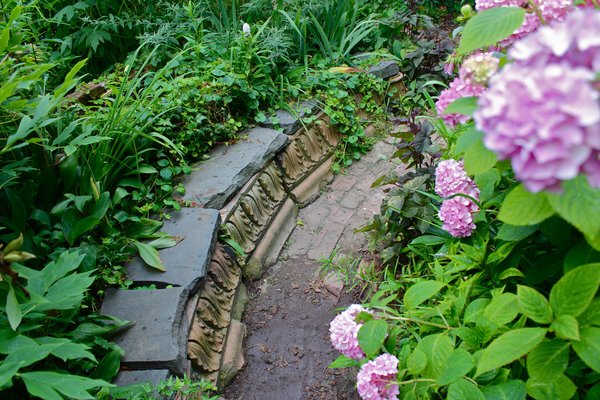 When the gardeners took over the abandoned spaces in Loisaida and began to transform them, they salvaged the rubble. They used the brick and the broken pieces of ornate cornices carved in brownstone and limestone from the fallen buildings. The brick paths in the garden and the flowerbed edges are from pieces of fallen tenements. The buildings live on nestled in the good dirt.