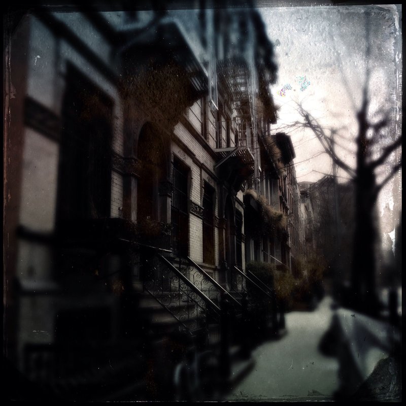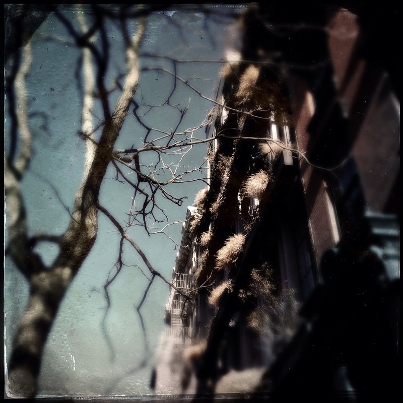 I took most of these photographs on East 7th Street between Ave C. (Loisaida Avenue) and Ave D. It is a block of stately homes from the 1800’s that is lined with very old street trees. I used the Hipstamatic Tinto 1884 Lens (befitting of my neighborhood) and both the C-Type Plate film, which has a color wash to it and the D-Type Plate film that is black & white. This lens and film combination was tricky with light. Too much sunlight and the contrast was extreme. Too little light and you got a blotchy photo. The best result was on a bright but overcast day.