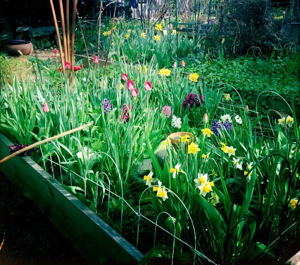 Last weekend we had the first sunny and warm days of spring. I visited community gardens with my friend Katy and our phone cameras. We stopped by 6BC Botanical Garden first. This garden began in 1981 and is a lovingly cared for and peaceful place. In the book Community Gardens of the East Village, gardener Cary York says, “One thing they did design wise that was so important was that someone wanted to build the raised boxes, and Diana said “Don’t do it, don’t do it. Well, if you’re going to do it, do them on a diagonal.” So suddenly, the garden had this whole diagonal thing which is so nice because it’s against the grid. Little by little people started lifting up the boxes and letting the soil be in the soil.”