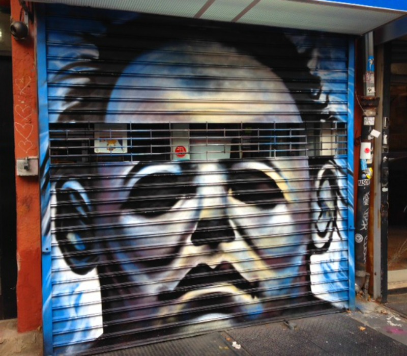 In late 2009 the New York City Council voted to phase out the metal roll-down gates that cover storefronts all over New York City in favor of the gates that you see covering the storefronts inside malls. They say the roll-down gates invite graffitti and are “scary”. Not surprising, the “mall-ification” of New York City continues. We have many storefront gate murals in Loisaida. Luckily we have until 2026 until they are all gone.